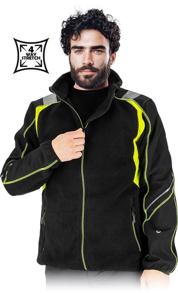 Bluza este echipată cu fermoar, guler înalt și două buzunare practice cu fermoar, ideale pentru depozitarea în siguranță a obiectelor personale. Manșetele și tivul elastice sporesc confortul și fixarea pe corp, iar materialul fluorescent combinat cu benzile reflectorizante segmentate cresc vizibilitatea în condiții de luminozitate scăzută, sporind siguranța utilizatorului.