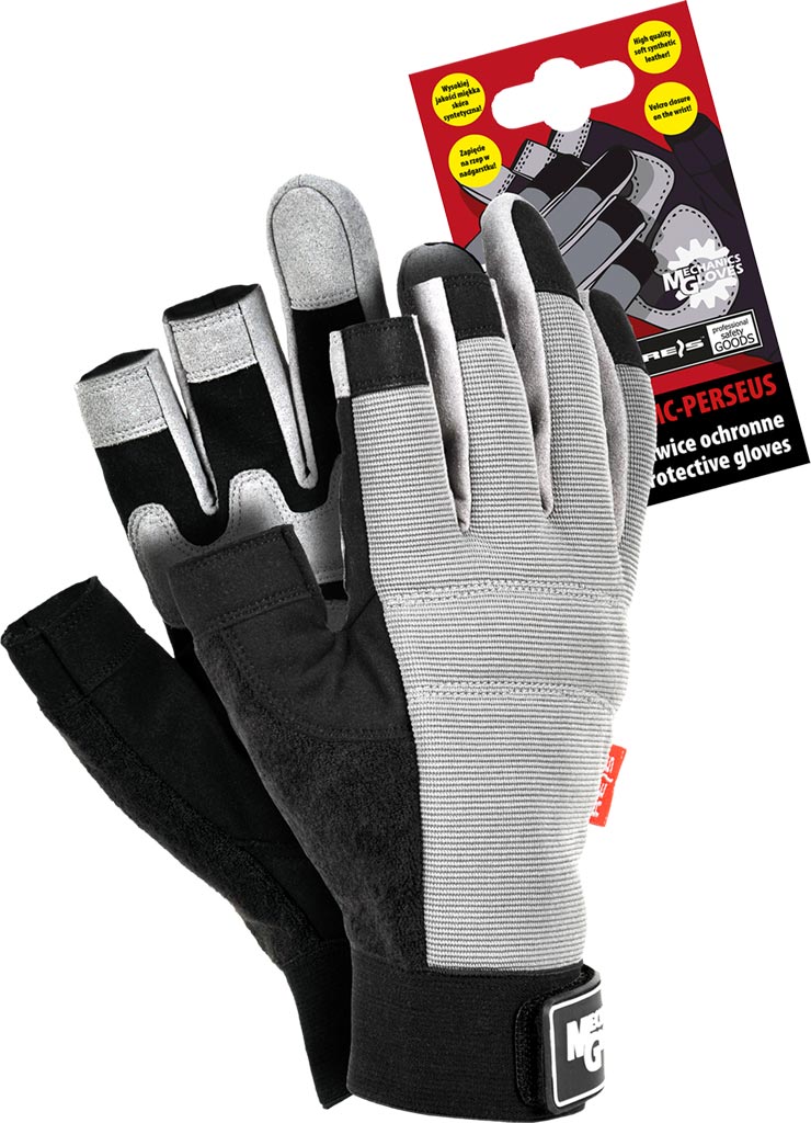 Mănușile de protecție din piele sintetică de înaltă calitate sunt combinate cu un material textil gri și nu au vârfuri pe degete, oferind libertate și dexteritate în munca de precizie.