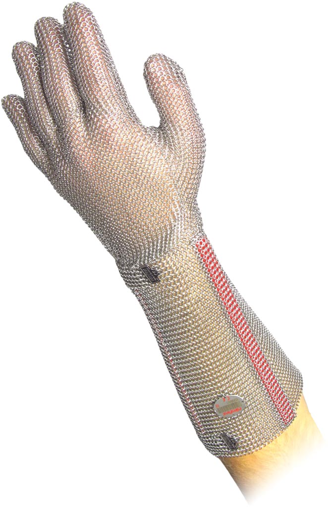 Mănușile de protecție Niroflex 2000 sunt realizate din oțel inoxidabil, cu manșete lungi de 19 cm, potrivite atât pentru mâna dreaptă, cât și pentru mâna stângă. Acestea sunt ideale pentru operațiuni de tăiere în care lamele se îndreaptă către corp, oferind o protecție excelentă împotriva tăieturilor și înțepăturilor în zonele acoperite de plasă metalică. Ajustarea se realizează facil cu ajutorul cataramelor metalice pentru a asigura o potrivire confortabilă și sigură. Mănușile sunt recomandate pentru lucrul în sistemul HACCP și sunt folosite frecvent în procesarea cărnii, materialelor sintetice, pielii și a altor materiale similare. Fiecare mănușă este vândută individual și îndeplinește cerințele standardului EN1082-1.