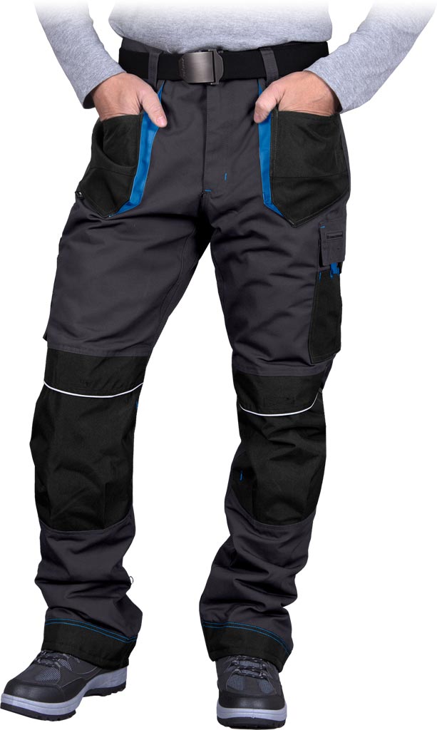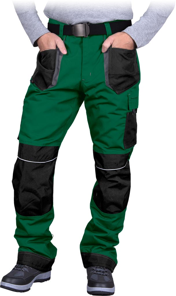 Purtătorii de genunchi pot fi inserați în buzunarele speciale de pe genunchi, în timp ce zonele critice, precum buzunarele, genunchii și marginea inferioară a pantalonilor, au întăriri suplimentare pentru o durabilitate sporită.