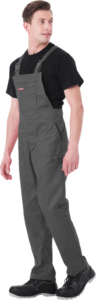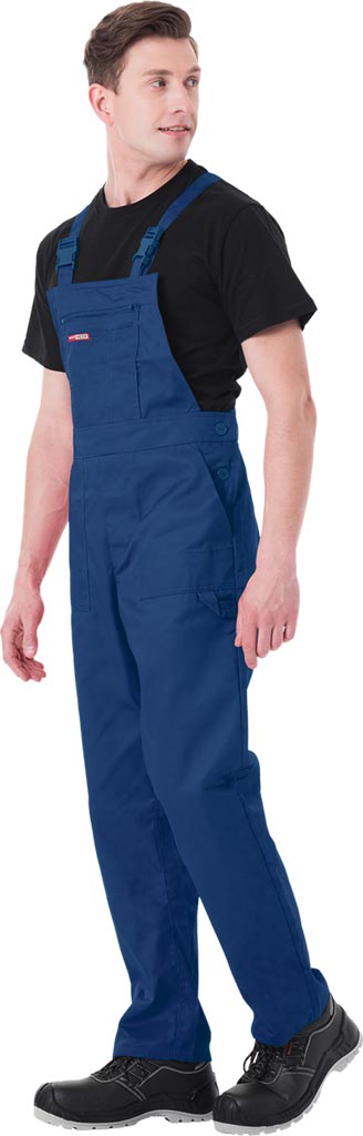 Pantaloni de protecție cu bretele MASTER, realizați dintr-un material țesut de înaltă calitate, compus din 65% poliester și 35% bumbac, cu un gramaj de 262 g/m2, care asigură rezistență și durabilitate.