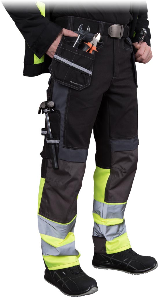 Pantalonii de protecție HAYER, realizați din material canvas de calitate superioară, oferă confort și durabilitate pe șantier sau în orice mediu de lucru solicitant. Materialul principal este 100% bumbac cu greutatea de 345 g/m², iar inserțiile rezistente din poliester și bumbac în nuanțe fluorescente și gri asigură vizibilitate crescută și rezistență sporită la uzură. Pantalonii sunt dotați cu multiple buzunare funcționale, inclusiv buzunare speciale pentru genunchiere cu închidere Velcro, buzunare pentru telefon mobil și un buzunar detașabil pentru ecuson, facilitând transportul uneltelor și accesoriilor esențiale. Sistemul de prindere cu nasture și fermoar garantează fixarea sigură, iar benzile reflectorizante conferă vizibilitate suplimentară, îndeplinind cerințele standardului EN ISO 20471, clasa 1. Întăriturile de la nivelul genunchilor și bazelor pantalonilor asigură protecție suplimentară în zonele expuse, făcând acești pantaloni alegerea ideală pentru profesioniștii care caută un echipament de protecție practic și durabil.