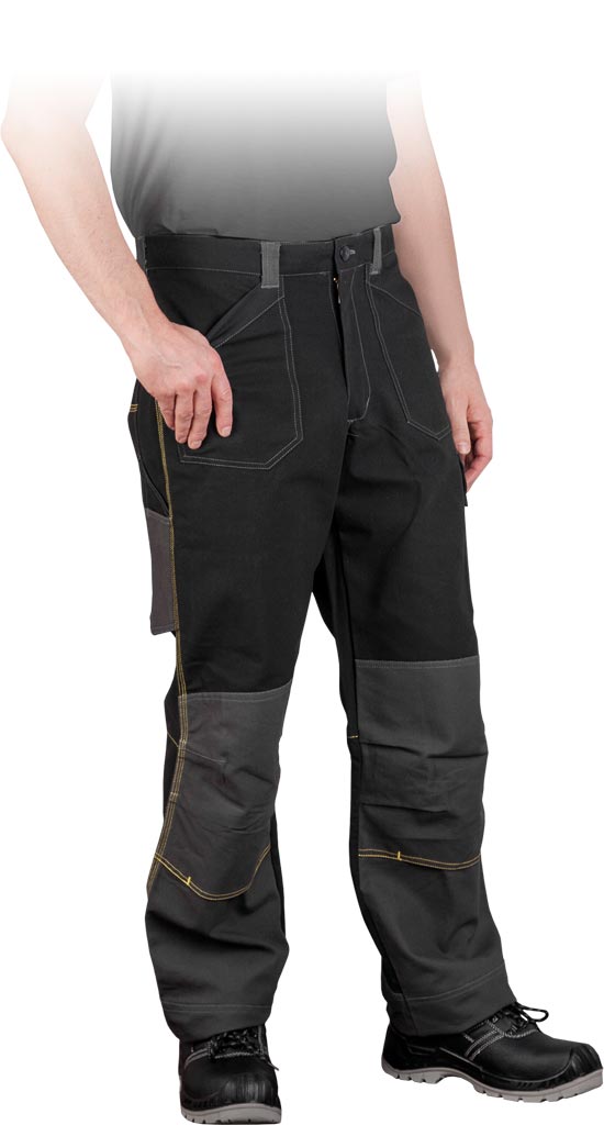 Pantalonii de protecție până în talie sunt realizați din 100% bumbac tip canvas, cu o greutate a materialului de 295 g/m², oferind durabilitate și confort sporit. Aceștia dispun de două buzunare laterale și două buzunare în partea din spate, incluzând unul cu velcro și un buzunar suplimentar cu fermoar pentru telefonul mobil, asigurând astfel spațiu generos pentru obiectele personale. Pe picioare se găsesc trei buzunare, ideale pentru depozitarea uneltelor, unul dintre ele fiind prevăzut cu închidere velcro pentru siguranță.