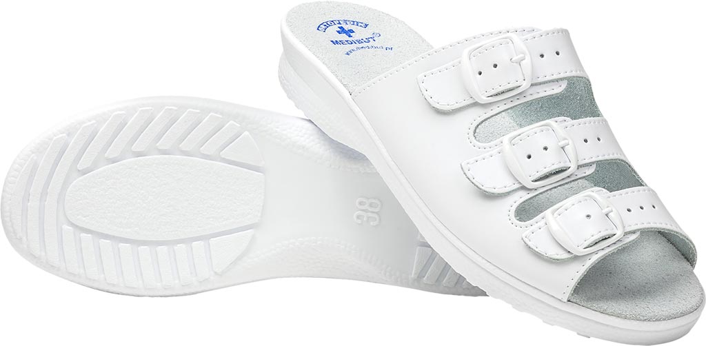 Saboții damă profesioniști oferă confort și siguranță pe durata întregii zile de lucru. Talpa din PU cu profil ortopedic asigură susținere optimă pentru picior, în timp ce partea superioară din piele naturală acoperită cu un strat rezistent la spălare garantează durabilitate și ușurință în întreținere. Trei barete cu catarame permit ajustarea perfectă a mărimii pentru un plus de confort. Căptușeala din piele naturală întoarsă oferă o senzație plăcută la purtare, iar protecția antiderapantă a tălpii asigură stabilitate pe suprafețe alunecoase. Talpa este, de asemenea, rezistentă la uleiuri și grăsimi, conform standardului EN20347, ceea ce face acești saboți ideali pentru utilizare profesională în diverse medii de lucru.
