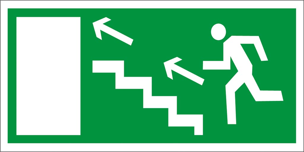 Semn de securitate pentru indicarea direcției de evacuare prin scări în sus, esențial pentru orientarea rapidă și sigură în caz de urgență.
