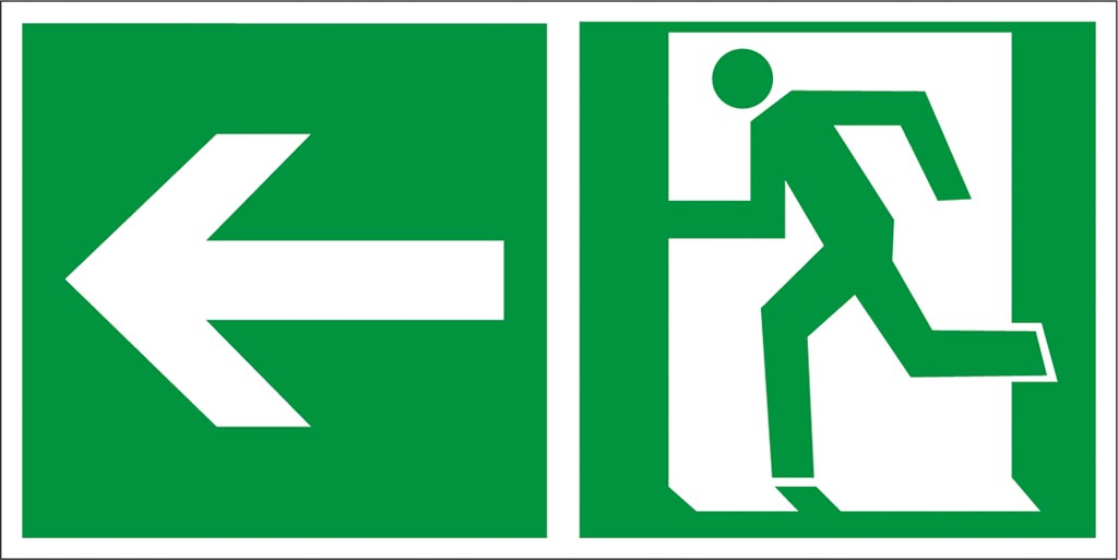 Semn de evacuare indicând direcția spre ieșire către stânga și înainte (după ușă).