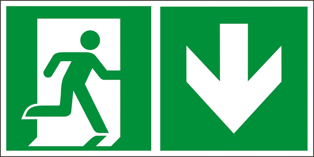Semn de evacuare „Direcția spre ieșire în jos (după ușă) spre dreapta”.